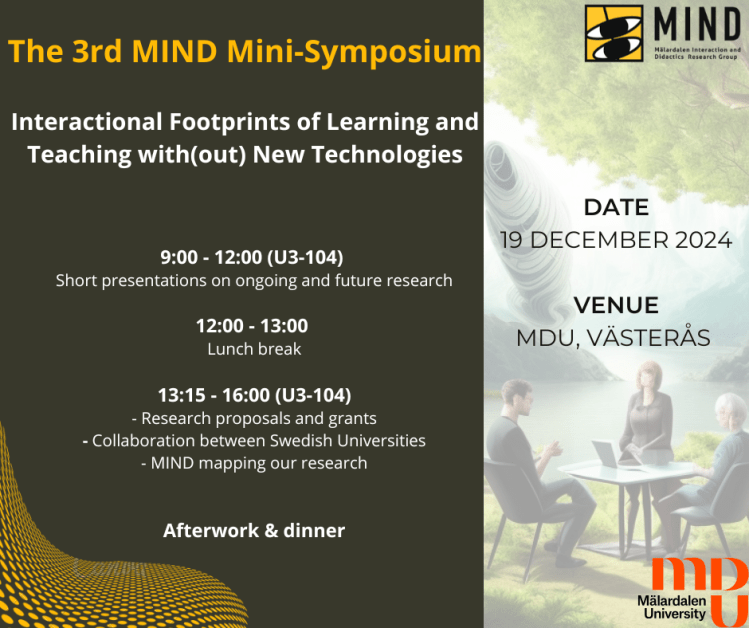 The 4th MIND (Mälardalen INteraction and Didactics Research Group) mini-symposium will take place at Mälardalen University, Västerås, on the 20th of November, 2025. The theme of our symposium this year is “Beyond the binary of progressive vs. formal: interactional research on learning and teaching on the way to hybrid intelligence”. Teppo Jakonen (University of Turku) will be joining us in person – the title of his talk is “Learning by doing? The interplay of progressive and formal education in scripted VR-based medical simulation training”. In addition to our MIND researchers at Mälardalen University, we will welcome researchers like Nigel Musk, Silvia Kunitz, and Amanda Hoskins from Linköping University.