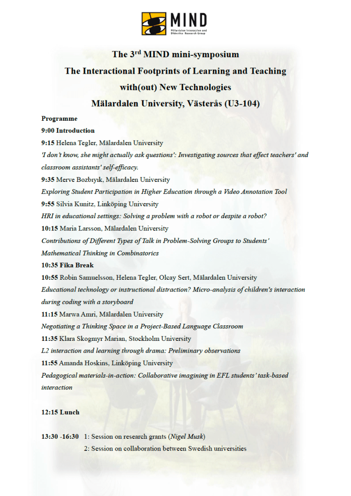 Pedagog Mälardalen has published a very good recap (på svenska) of the 3rd MIND (Mälardalen INteraction and Didactics) mini-symposium held at Mälardalen University. We engaged in discussions about research that is at the intersection of interaction and education, as well as research grants & collaboration between our research groups. We had a fantastic line up of presenters from Mälardalen University, Linköping University, and Stockholm University, who presented research on human-robot interaction in educational settings, CARM and teachers’ self-efficacy, student participation and well-being, children’s interactions during coding with a storyboard, project-based language teaching, interaction and learning through drama, and task-based interactions. Stay tuned for our research events in 2025!